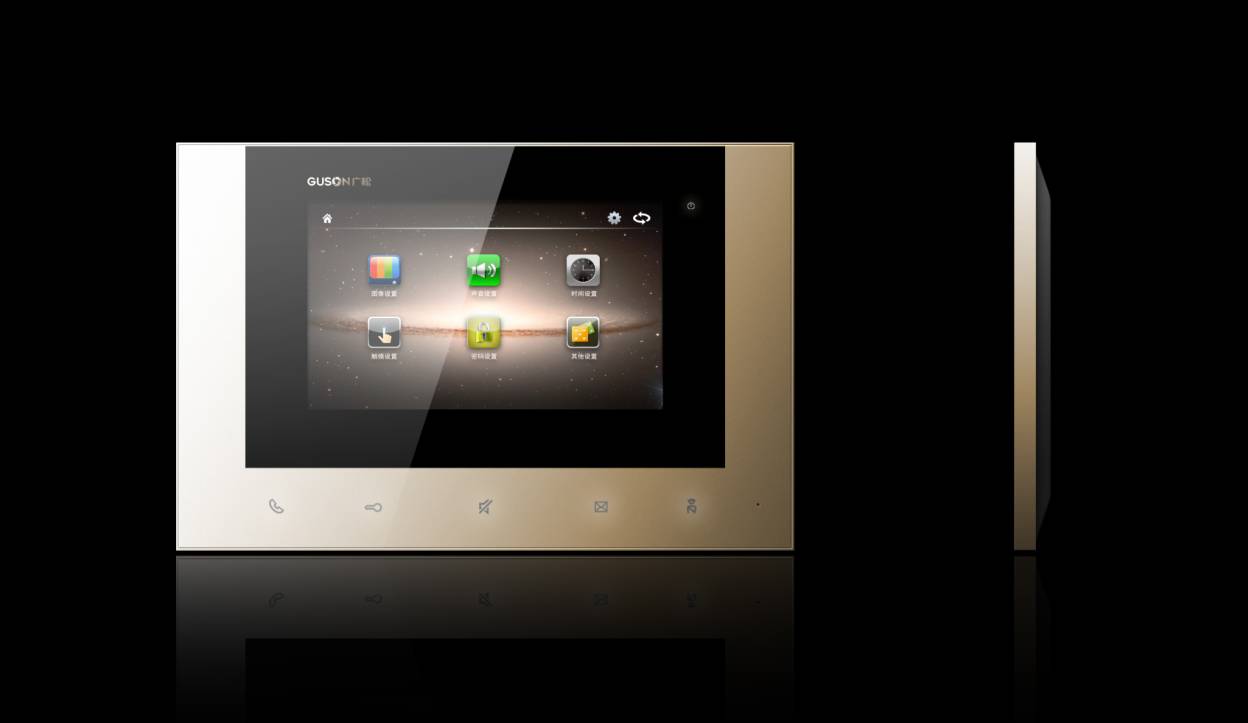 7寸数字分机采用香槟色/银色外观设计,整体显得简约大方,适合与多种室内装修风格相搭配;融入了流行的镜面元素,让分机具备几分艺术感与科技感;搭载7英寸TFT高清显示屏,使得监视、对讲、操控等更加简单。屏幕下方的“GUSON”经典logo立体感十足,隐约散发出深厚的品牌底蕴。